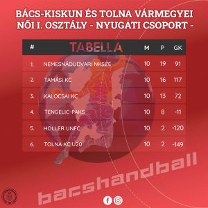 Az idei második, sorrendben a tizedik fordulót rendezték a hétvégén a Bács-Kiskun és Tolna Vármegyei közös I. osztályú női kézilabda bajnokságban. Péntektől egészen vasárnapig mind a keleti mind a nyugati csoportban három-három találkozóra került sor.