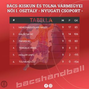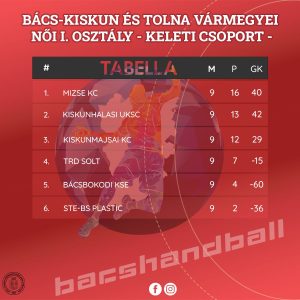 A Bács-Kiskun és Tolna Vármegyei női I. osztályú bajnokságban egymáshoz helyezésben és pontszámban is közel álló csapatok mérkőztek a győzelemért. A keleti csoportban három párharc tette teljessé az idei első, sorrendben 9. forduló mozaikjait, míg a nyugati csoportban, a két helyszínen a vendégek látszottak esélyesebbnek.